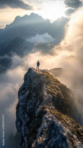 Lone Hiker. Rocky Cliff Overlooking Cloud-Covered Peaks. Dramatic Morning Sun. Landscape Background.