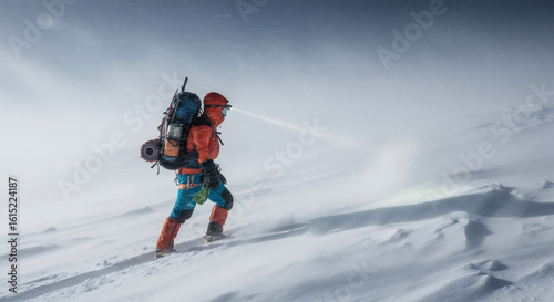 Lone mountaineer with a headlamp battling a fierce blizzard during a challenging winter ascent on a snowy peak.