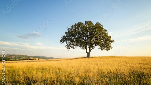 Lone oak tree on a golden field under clear blue skies in a tranquil landscape : Generative AI