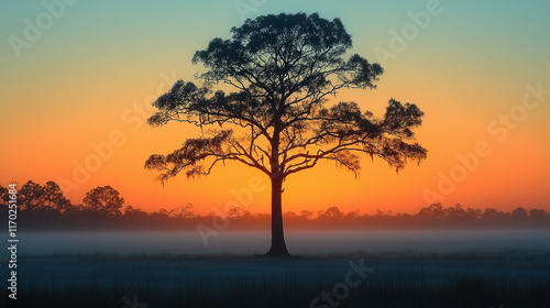 Lone tree silhouette against vibrant sunrise in misty field.