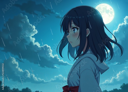 lonely anime girl with long blue hair looks out at a beautiful night sky with a full moon and falling rain. She wears a traditional kimono with a red bow.