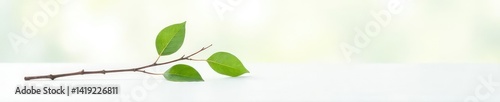 Long and thin branch with a few leaves on a white surface, peaceful, clean