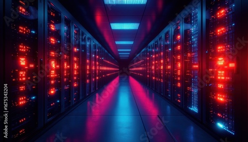 Long corridor of a high-tech server room illuminated with red and blue LED lights reflecting on the floor, showcasing rows of computer racks and advanced technology