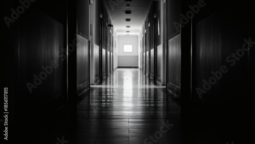 Long, dark, empty hallway with light at the end, creating a sense of mystery and anticipation.
