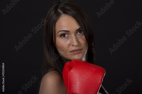 Long dark hair beautiful girl with red boxing gloves and fitness dress ready for exercise