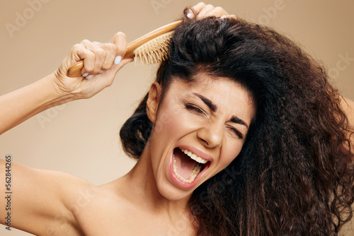LONG HAIR PROBLEMS. NAUGHTY HAIR CONCEPT. Suffering screaming angry tanned curly Latin lady with hairbrush suffer with unruly hair posing isolated on pastel beige background, close eyes. Copy space