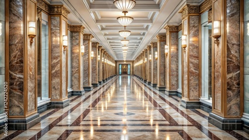 Long shot of a marble hallway lined with identical marble pillars and ornate mirrors, pillars, decor, marble, decoration