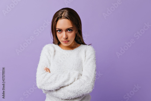 Long-haired brunette with green eyes offended and stands in closed pose. Closeup portrait of young girl in white warm sweater on lilac background