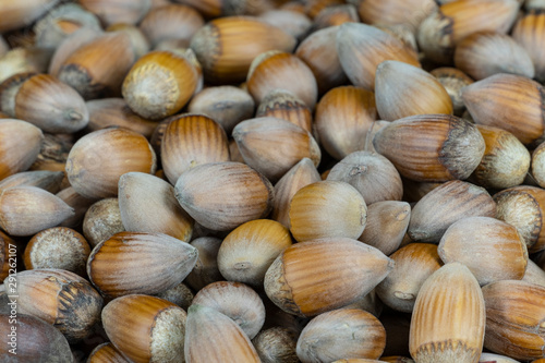 Long-shell hazelnuts from organic farm. A close-up of nuts in shells