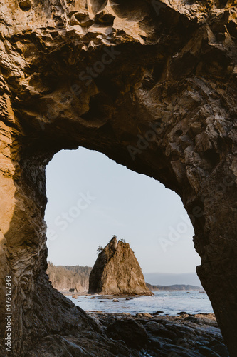 Looking through Hole in the Wall sea stack during Rialto Beach sunset