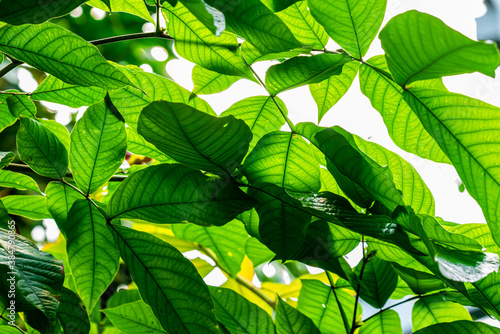 Looking up on the dense green canopy of leaves and branches in an old rain forest.