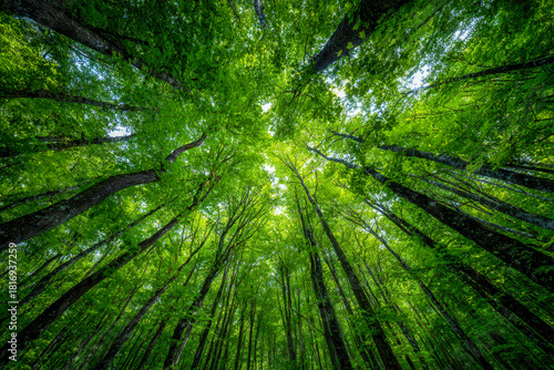 Looking up through a dense canopy of vibrant green trees in a lush forest with sunlight filtering through the fresh spring foliage and tall trunks