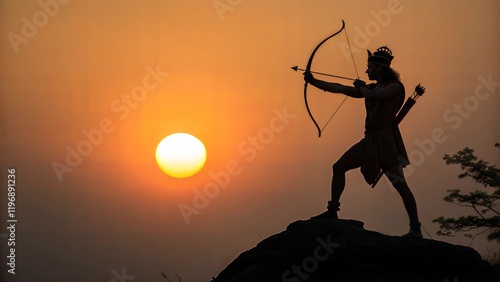 Lord Rama silhouette with bow and arrow on sunset background. Ram Navami festival celebration background for holiday