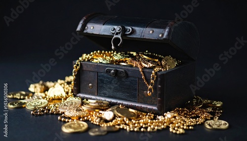 Los artefactos dorados y el cofre de madera sugieren un tesoro pirata. La imagen simboliza el peligro, el desafío y el espíritu rebelde de la vida pirata. Fotografía hiperrealista.