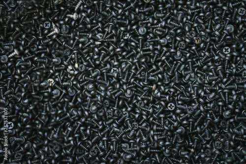 Lot of black small screws for repair and fasteners in a box close-up.