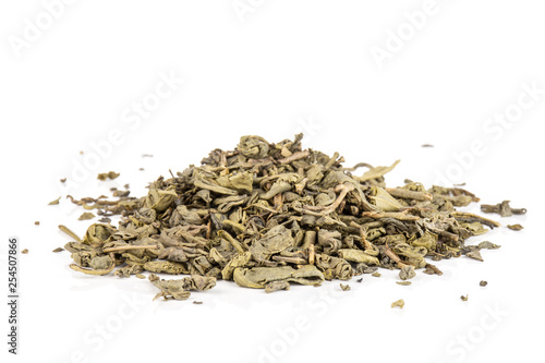 Lot of pieces of dry green tea heap isolated on white background