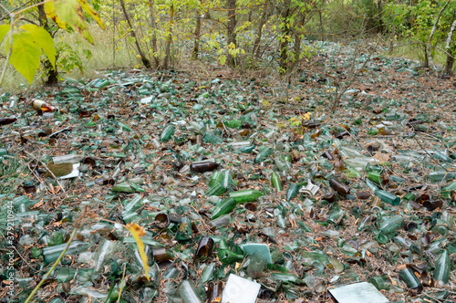 Lots of old broken bottles. A lot of broken glass. Waste bin made of glass bottles.