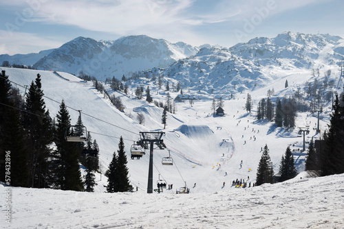 Lots of skiers and snowboarders on the slope at ski resort