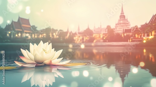 Lotus flower on water with sparkling reflections and a bright temple in background
