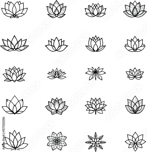 Lotus Variations Icons A Vector Grid Featuring 20 Unique Lotus Flower Silhouettes Ranging from Minimalist to Ornamental Styles