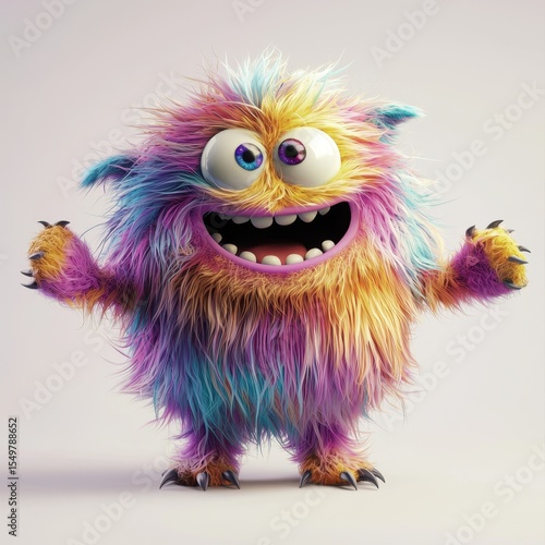 Lovable furry monster with multicolor wavy fur and cute chubby arms