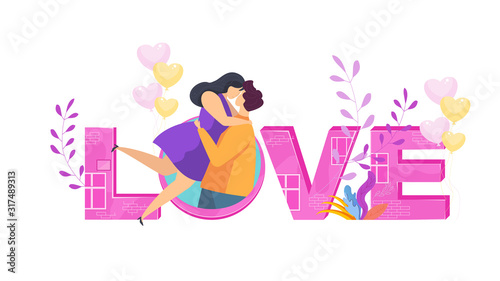 Love lettering. Hugging couples in love.