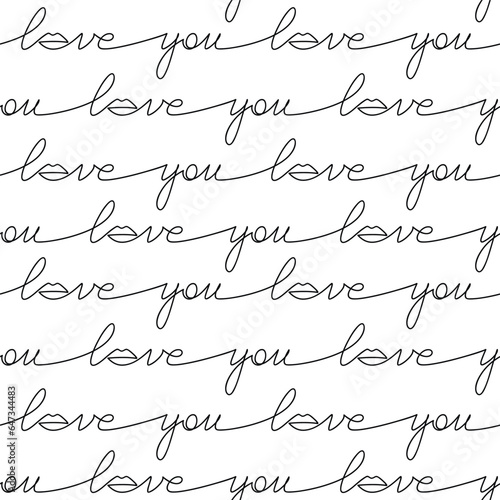 Love You hand writing vector. Line continuous seamless pattern. Slogan, quote, text, lettering, calligraphy, graphic design, print, banner, poster, Valentine’s Day card, wallpaper, background.