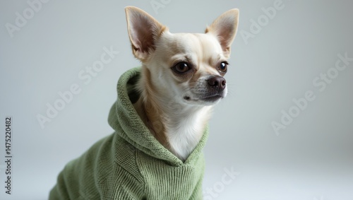 Lovely pale yellow chihuahua in pet apparel isolated on a white studio background. Concept of canine fashion, animal lifestyle, and veterinary care.