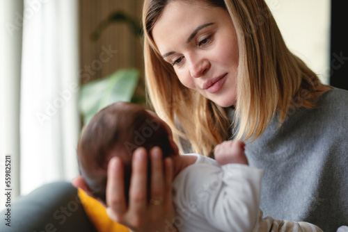 Loving mother hugs her little baby at home