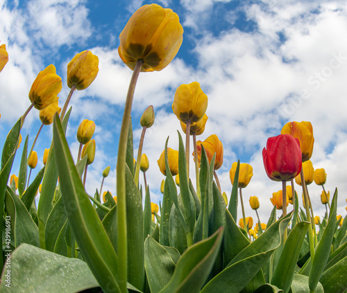 Low angle shot of red and yellow tulips