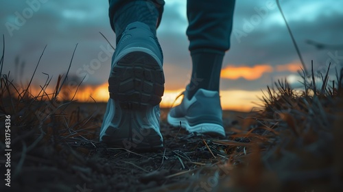 Low angle shot of shoes running at nature outdoor twilight sky