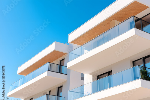 Low-angle architectural shot of a contemporary white building with glass balconies against a bright blue sky, showcasing modern design and clean lines.