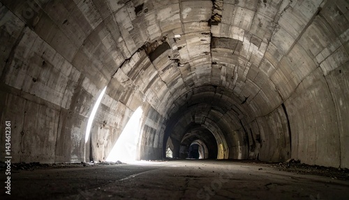 Low-angle photo of a massive, aged concrete tunnel with jagged cracks and a single beam of light leaking through