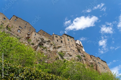 Low-angle view of the buildings of Pitigliano standing on a lush hill