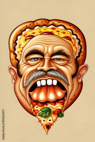lowbrow illustration of a cartoon pizza mascot caricature. Funny, Humor, Food, Graphic design, Illustration, Comic style, Pop art, Retro, Mouth, Pizza slice, Funny face, Cheesy, Delicious, Tomato