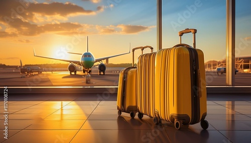 luggage at the airport terminal - In warm glow of a summer sunset, a wide-angle view captures vibrant yellow luggage bags