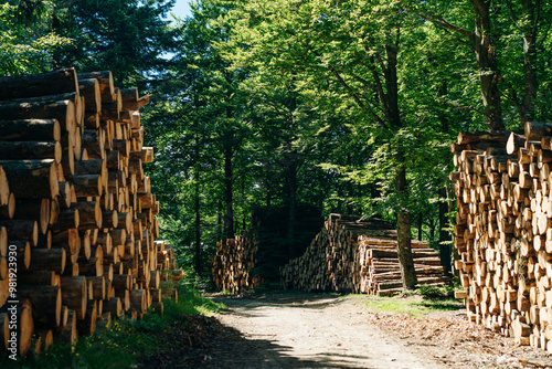 Lumber wood. Sawn cut trees, logs close up background texture. Firewood, deforestation, forest destruction
