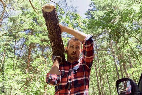 Lumberjack carrying log on shoulder in forest