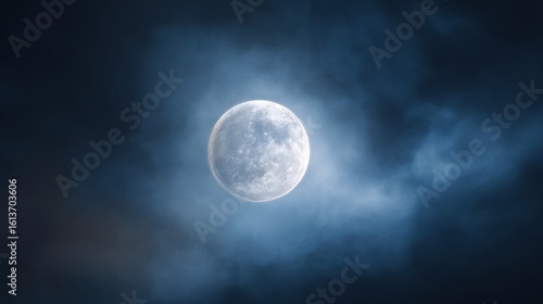 Lunar Majesty: A captivating shot of the moon, suspended serenely in the dark, shrouded with soft, ethereal clouds, is a beautiful depiction of the night sky. Captures a sense of mystery and peace.