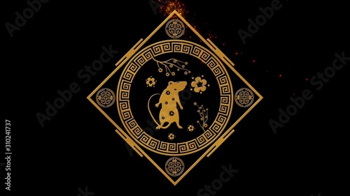 Lunar New Year, Spring Festival background with golden rat, fireworks. Chinese new year black starry night backdrop for holiday event. 3D rendering.