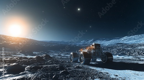 Lunar Rover Explores Alien Planet Landscape At Sunrise