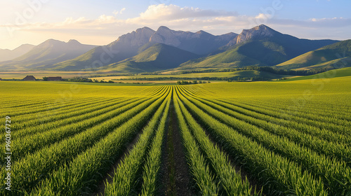 Lush Agricultural Fields Beneath Majestic Mountain Range at Golden Hour