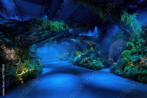 Lush, blue-lit, botanical tunnel