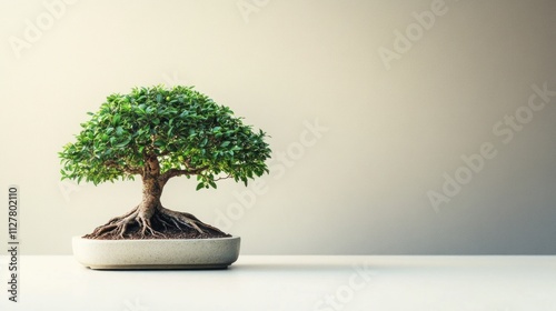 Lush bonsai tree with thick roots, isolated on a soft white surface, minimalist lighting