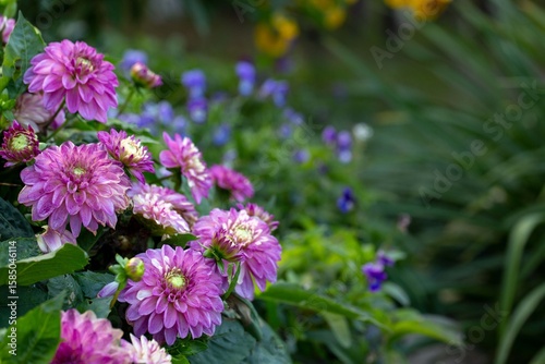 Lush bright dahlias on a flower bed. Perennial flowers.