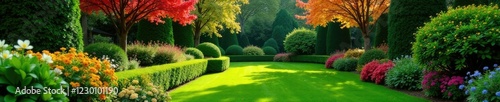 Lush evergreen hedge surrounding garden bed with deciduous trees and flowers, garden, fall, winter