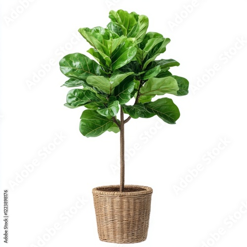 Lush fiddle-leaf fig in a woven basket planter.