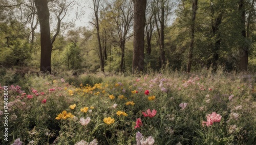 Lush field of colorful wildflowers bursts with life amidst a tranquil forest backdrop