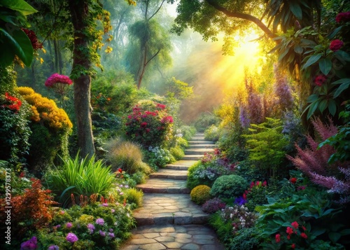 Lush Garden Pathway: Double Exposure Botanical Photography