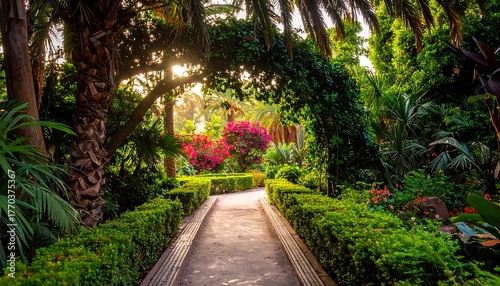 Lush Garden Pathway Under Palm Tree Archway with Vibrant Flowers